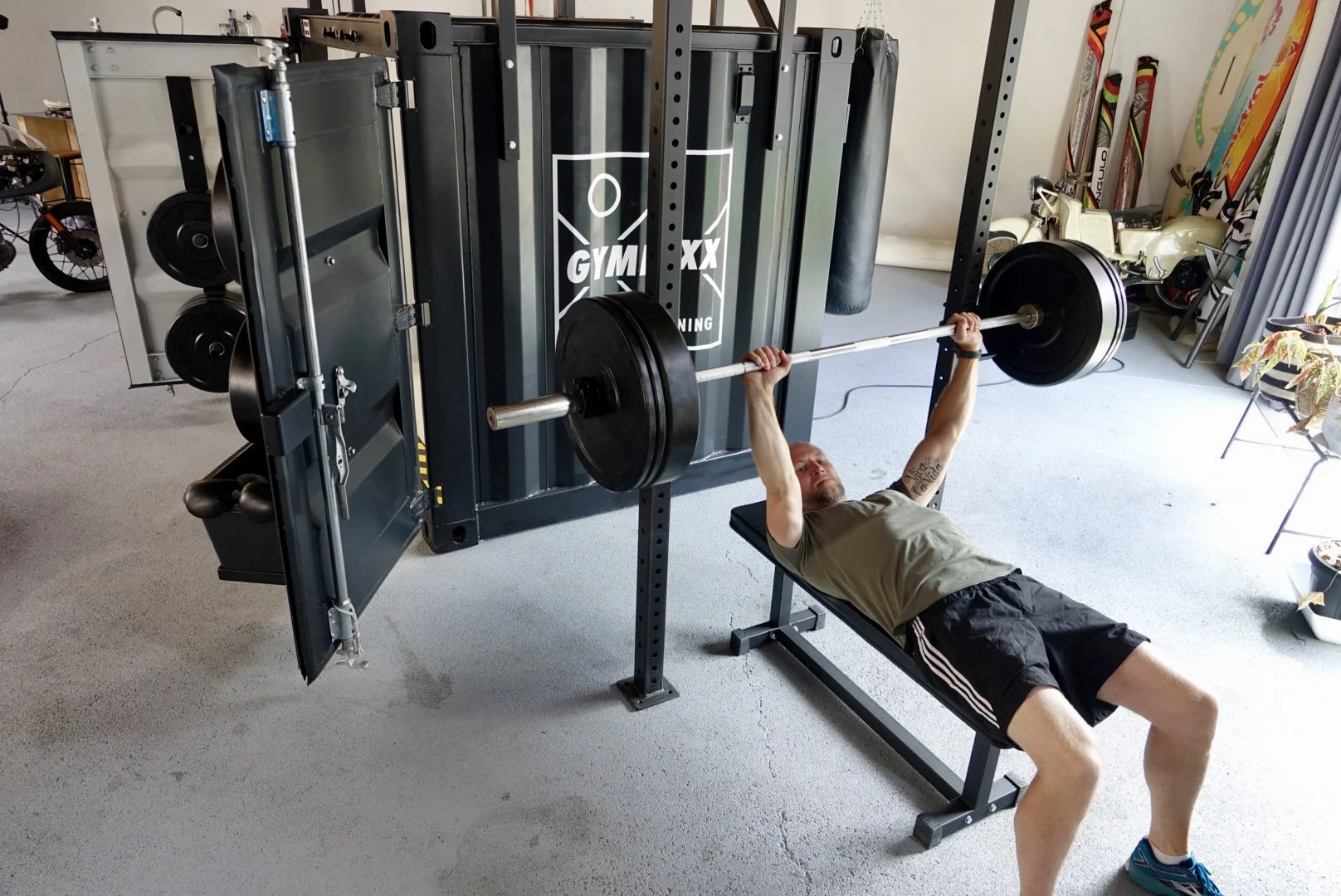 Afhankelijk van de ruimte en opstelling worden aan beide zijde en aan de achterzijde van de container multifunctionele trainingsrekken gekoppeld. Squats, dips, pull-ups, bench pressing, boxing vrijwel alles is mogelijk.